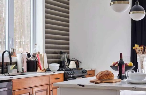 - fully-stocked kitchen with modern appliances and an island with a breakfast bar