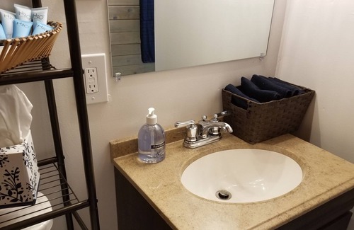 the spacious bathroom has an oversized shower and a clothes dryer that really comes in handy