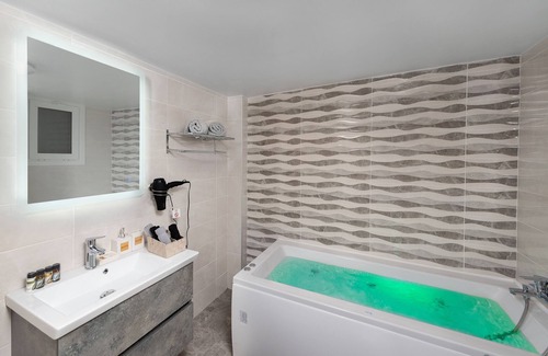 the flat consists of four fully equipped bedrooms, four bathrooms, a kitchen with a separate dining area and a stylish living room On the exterior guests may find a spacious veranda of 60 sqm, where they could enjoy their breakfast and a large garden. Each of the bedrooms is equipped with air-conditioning, 32’ flat-screen TVs, spacious wardrobes and an office with a chair, where guests could use for their laptops. Guests can enjoy the relaxation offered by a jacuzzi, which is located in one of the flat’s bathrooms. The fully equipped kitchen comes with an oven and kitchen, a spacious fridge with deep freezer, a Nespresso coffee machine, a microwave oven, a sandwich toaster and a kettle, while the modern style living room comes equipped with a 55’ flat screen tv. A washing machine and tumble dryer, iron and ironing board, clothes rack and hair dryers can be found on premises. Wi-Fi access is offered across the flat’s premises..