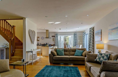 step inside this light and airy family holiday home that has been beautifully styled to create a warm and inviting coastal sanctuary with natural tones and splashes of sea blues The open-plan living/dining/kitchen area creates a great space to spend quality time catching up with everyone, whilst also allowing ample room for people to just sit back and relax and take it all in their stride. Everyone can keep the chef company sitting at the breakfast bar or kitchen dining table while they eagerly await a tasty breakfast to fuel them for the day’s adventures. The kitchen is well-equipped with everything you need including a Nescafe coffee machine (Dolce gusto pods only) and dishwasher. A handy utility room with a washer/dryer and a separate shower room and WC is also located just beyond the kitchen. For evening and celebratory meals, a separate dining room is located on the ground floor which also doubles as a playroom with a dart board, table football, mini table-tennis, games, lego, Smart TV and bean bags. After a full day of explorations when it’s time to hit the hay, head up the oak staircase where you will find three comfortable and spacious bedrooms. A Twin bedroom with a Juliet balcony overlooking the fields and an en-suite bathroom. A double bedroom with an en-suite shower room and a delightfully bright and airy King bedroom. A family bathroom with WC completes the inside of this property.