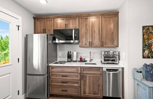 When staying at RiverWest you will receive 20% off Bike Rentals at Ski Hut Adventures. Welcome to Hunters Lodge! With stunning views of the St. Louis River and convenient access to the water, 12 trailheads, and Spirit Mountain, this new (May 2024), beautifully appointed home celebrates the best of western Duluth. Owned by three proud Denfeld HS alumni (the “Hunters”), its design includes locally crafted outdoor furniture from Loll Designs, and cozy, eclectic interior furnishings expressing local, regional, and global influences. The two-floor layout maximizes flexibility for large groups and extended families. Each floor contains two bedrooms and a convertible sofa. Upstairs features an open floor plan with large entertaining spaces, including living area with fireplace, dining area, a full kitchen and pantry, and a large BBQ deck overlooking the river; downstairs has its own efficiency kitchen and river-view patio with BBQ and picnic table. Part of the RiverWest community, Hunters Lodge is the closest home to the river. The community offers easy access to nearby kayak and other boat rentals for exploring the river, and a wealth of year-round outdoor activities including downhill and cross-country skiing, snowboarding, snowmobiling, all kinds of biking, hiking, fishing, and more. Yet, I-35, Lincoln Park, Canal Park, Lake Superior and most Twin Ports destinations are all only minutes away..