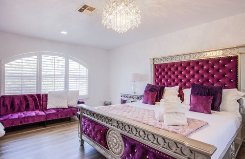 inside, enjoy selfie stations all throughout the home, perfect for capturing memories of your once in a lifetime experience at our place The living room area has been transformed into your own private Karaoke Lounge with plenty of room to dance (DJ light included!). The newly renovated kitchen has fully equipped stainless steel appliances, including a stove with convection oven and griddle cooktop, granite countertops, a spacious breakfast bar, and dining nook with table for eight guests.
