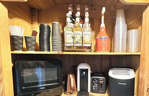 the kitchen is equipped with all the necessities to cook You will also find a fully stocked breakfast bar that has a toaster, tea kettle, Nespresso machine, ice maker, and microwave. I’ve stocked it with 9 flavored syrups so you can try a new fun latte or coffee every morning.
