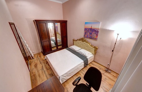 The entrance hall meets truly luxurious, there is a fireplace and a sofa. Each of the bedrooms has its own special character. The first has two beds - double and single. In addition, there is a chest of drawers, two bedside tables, a mirror and a four-door wardrobe, two doors of which are mirrored. The second bedroom has a truly royal bed with Versailles decoration thanks to monograms and gold. A work desk and a four-door wardrobe with a more mundane look slightly set off the luxury of the bed. The third bedroom has a chocolate accent wall, an ivory double bed, two bedside tables, a rocking chair with a pouffe, a chest of drawers with a mirror, air conditioning and a wardrobe with mirror inserts. The living room impresses with its splendor: a furniture set consisting of a sofa and two armchairs to match it, a double bed, a chest of drawers, a coffee table, a plasma TV, air conditioning, a pouffe and a dining table - these are its components. A large designer kitchen in coffee and chocolate color with a large number of shelving, light colors of the floors, the height of the ceilings and windows smoothly and harmoniously fit into the interior of the kitchen. From home appliances there is: - gas stove with oven; - microwave; - Electric kettle; - fridge. In some bedrooms, there is an exit to the balcony from which there is a pleasant view overlooking the city. The bathroom is equipped for the convenience of guests: - bathroom, hidden for convenience in a niche - washing machine; - a mirror with illumination; - laundry basket; - boiler..