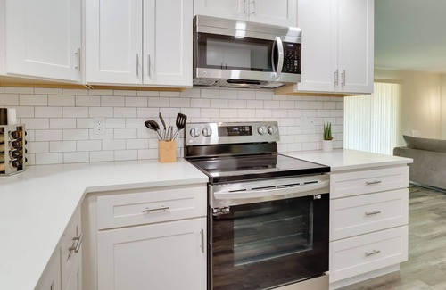 kitchen: drip coffee maker (coffee provided), coffee grinder, cooking utensils, dishware & flatware, dishwasher, microwave, spices, toaster oven
