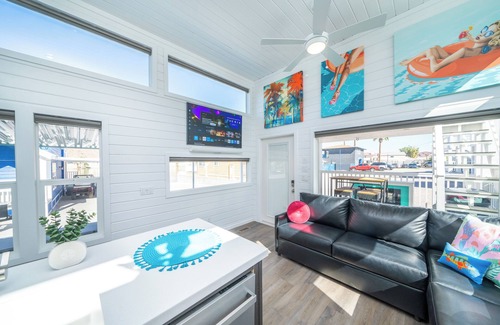 nestled within the serene beach bungalows of roadrunner resort, 'sandy cheeks', space #4, offers a tranquil retreat where coastal charm meets modern comfort This uniquely designed 2-bedroom, 2-bathroom bungalow accommodates up to 6 guests, featuring two queen-size beds and a cozy pull-out sofa bed.