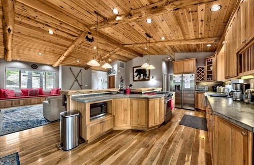 Welcome to our log cabin in the woods! Ideally located at the end of the street with access to Saxon Creek trail and endless acres of forest and miles of hiking, mountain biking, and snowshoeing from the front door. What we love about this home is the privacy and the feeling of being in the mountains and woods, with views of tall pines from inside, including from some of the bedrooms. Spread out between the two open-concept living areas, soak in the hot tub, find yourself in a competitive game of pool, warm up by one of the two stone fireplaces, prepare a meal for family in the custom kitchen, or just be lazy and lay around on our large sectional and watch a game or a movie. although tucked away from the hustle and bustle of town, the cabin is also only 8 miles from town and 7 miles to lake tahoe, with very easy access to heavenly, sierra at tahoe, beaches, grocery stores, and restaurants,
