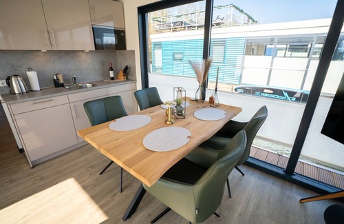 Escape from everyday life can be so easy! Firmly anchored on the waves, the houseboat offers everything your heart desires with a fully equipped, high-quality living space (44 m²) and two sun terraces (40 m²). In one of the most beautiful holiday regions in North Rhine-Westphalia, the Weserbergland, a vacation in a luxuriously furnished floating house awaits you. Living on the water and enjoying the breathtaking view will leave you feeling completely relaxed after just a few hours, and you'll hardly want to leave your vacation home. The sleeping and living areas are stylishly furnished. The two separate bedrooms with double beds, the fully equipped kitchen, and the modern shower room with a separate toilet offer all the comforts you need for a relaxing vacation. now relax on the terrace or on the sun deck with a beautiful and soothing view of the lake and enjoy your time! highlights included: final cleaning, linen package, all consumption-dependent energy costs, wi-fi, parking space