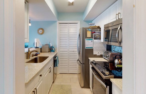 the comfortable living area features wood flooring, quality sofas, a large smart roku tv and high speed comcast wifi to stream all your favorite shows on netflix and amazon! the main living area sofa pulls out into a sleeper sofa for extra guests The kitchen includes beautifully upgraded appliances for home-cooked vacation meals. For added convenience and easy packing, a high quality washer/dryer is just off the kitchen.