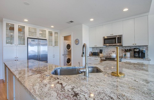 guests enjoy a great layout with a gourmet open kitchen overlooking the large living room and dining area Curl up and enjoy TV shows on the 47" wall mounted HDTV, cook your favorite vacation meals in the well-stocked kitchen and create lifelong memories sharing meals together at the large dining table that comfortably seats all your guests with great views while cooking and dining. A high efficiency laundry center is located in the pantry off the kitchen for your convenience.