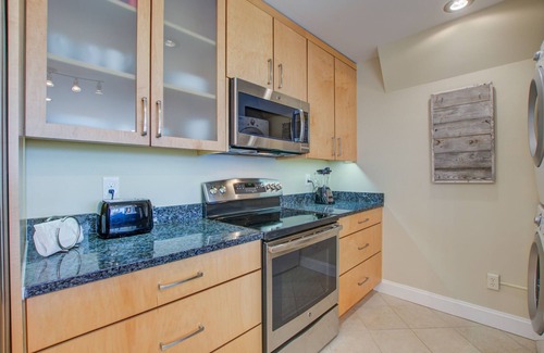 the kitchen features granite counters, stainless appliances, both keurig and drip coffee makers, high quality blender, and everything you’ll need to cook meals for your stay