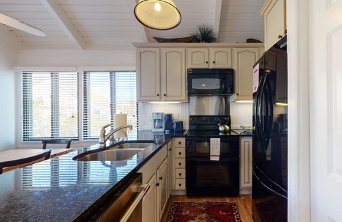this beach cottage boasts updated interiors and new wood floors throughout! the living area is adorable and comfortably furnished with a smart tv for streaming your favorite shows and large picture windows that overlook palm trees and the marsh offering great views and abundant light The kitchen is gorgeous with granite counters and a nice eat in area. It is well stocked and offers everything you need for in house dining convenience. grab some local shrimp and grill them up on the gas grill! keurig and regular drip coffee makers for the java enthusiasts!