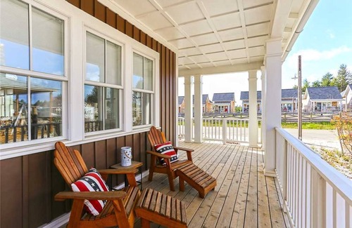 the front of the house gives the air of welcome with an amazing farm-style front porch furnished with comfortable seating and a space heater It is a cozy place to wave to neighbors year-round, watch the kids riding bikes while you have a glass of wine, or play a game of cards in the late afternoon sun. All the paths in the Farm District are strung with bistro lights, which looks whimsical in the evening. All of the homes also have wonderful front porches that face one another so meeting your neighbors seems effortless.