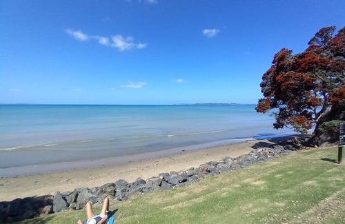 Beautiful sunrise location. Walk to Red Beach for great safe swimming, surf club cafe, explore the rock pools or laze the day away looking over the Hauraki Gulf. Campground amenities inc. Playground, trampoline, flying fox, private steps (Jacobs ladder) to a hidden Cove. take-a-way meals.