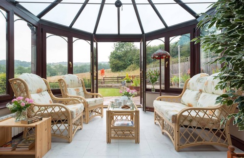 the good size conservatory overlooks the garden and is light and airy with comfortable seating to sit and relax or read