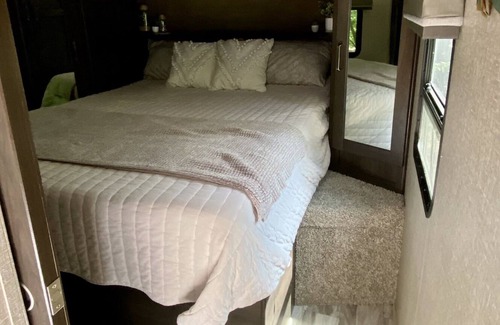 Take it easy at this unique and tranquil getaway. New modern two bedroom camper sits with a fantastic view of swimmable stocked pond for fishing. Peddle boat and a John boat are available for use as well as floats and fishing poles. Theis home away sits on nearly 26 acres of woods with trials and a serene grassy field for picnics and games. Deer, birds, and other wildlife abundant. Enjoy the Winery down the street or a stroll by the shops in Downtown Greenville..