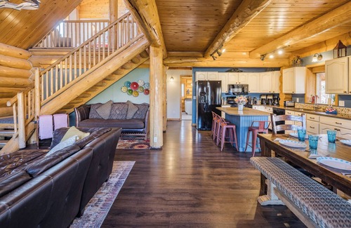 the main floor has a great room with living, dining and kitchen all shared -- a wonderful large space to gather and relax The living room has a high vaulted ceiling, gas fireplace, and a 55" flat screen with a Blu-ray Player and Netfix, Hulu and HBO Go accounts for you to relax after your adventures. Dining room has an extendable table that can sit up to 10 (12 if you've got kids). Seating for 4 more in the kitchen around the island. Kitchen has beautiful quartz countertops, rustic farmhouse style cupboards, and plenty of space to have a few cooks in the kitchen. Master bedroom has a queen bed and twin bunks, large closet, attached bathroom, and a private deck. Laundry room and 1/2 bath are in the back out of the way.