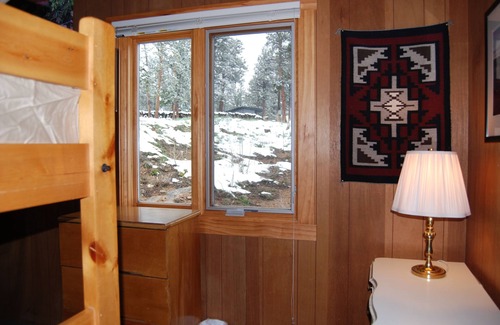 the first floor includes a combined kitchen, dining room and living room, as well as two bedrooms and bath Upstairs is a large loft overlooking the living room that most guests use as the master bedroom because of its large windows, the king size bed and it's stunning views of Mt. Meeker.