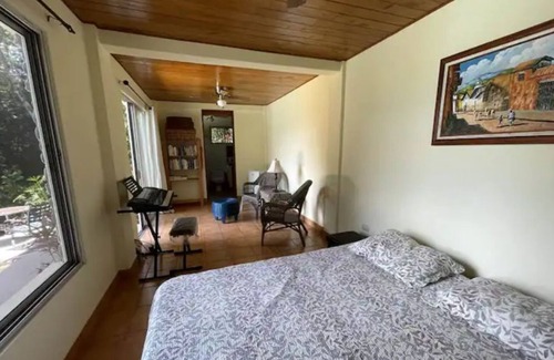 Enjoy the peaceful surroundings at this comfortable home in Punta Mir, only 15 minutes from Dominical and the beach. Since it is in the mountains, it is much cooler than at sea level and very serene. There is a full kitchen, living area, main bedroom and bathroom on the first floor and an outside stairway to the second floor with it's own bedroom and bathroom. Outdoors is a pool, barbeque and covered dining area where you can relax and enjoy the spectacular view of the mountains and valley.