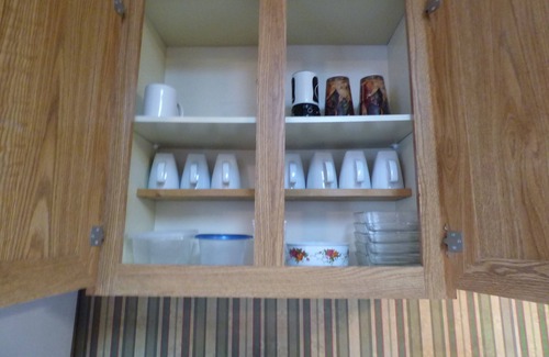 the kitchen is fully furnished with all appliances, fridge, dishwasher, microwave, toaster oven and coffee pot We even supply your coffee (Folgers) and condiments. Dishes, glasses, cook, bake ware and all utensils are also provided. The griller in the family has a charcoal grill in the back complete with patio furniture.