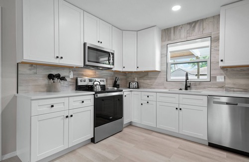 walking in you will be amazed by the fully renovated appearance of the home and greeted by a living room with plenty of seating and a smart tv to watch all your favorite shows and movies To the left of this room, you will find the kitchen and dining rooms. In this kitchen, you can find all of the utensils and appliances that you would need to cook your favorite meals including all new stainless steel appliances. In the dining room you can enjoy your meals at a table which fits 6 people.