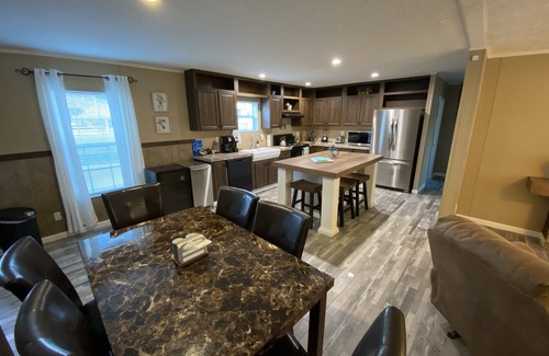 3-bedroom 2-bath lake front home built in 2018 with all new furnishings installed Fall of 2020. Enjoy your private 2.4 acres on a secluded cove (seasonal water*) with a 10 ft by 20 ft dock/swim platform. With the cove being so quiet it is great for swimming, using the peddle boat or the two kayaks provided with the home. The yard includes a fire pit and a picnic table located in a small grove to keep cool in the summer heat.