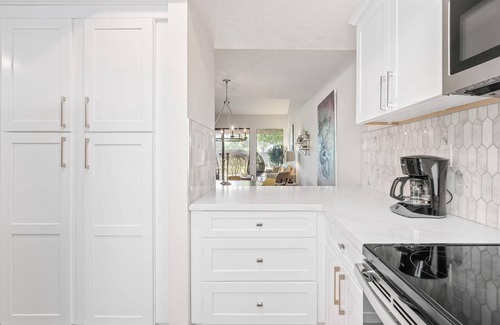 featuring mid-century decor, tall ceilings, a fully updated kitchen, 1 spacious primary suite and 1 guest bedroom, with 2 tastefully updated bathrooms The condo is also equipped with a BBQ and washer/dryer.