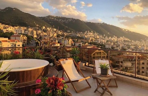 it's an open modern space with a huge terrace with breathtaking views over the sea and the mountains The terrace includes a big round jacuzzi from which you can enjoy an amazing sunset. Conveniently located between Beirut and Byblos, you have an easy access to the main tourist attractions, avoiding the hassle of Beirut. You will enjoy a Pool Billiard, Wifi, smart tv, air conditioning ...an experience you will not forget