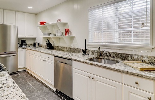 upon entering, you'll be greeted by central ac, ceiling fans to circulate the air, and an open-concept living area that makes up the heart of the home There's a kitchen equipped with stainless steel appliances (including a gas stove and a dishwasher), a breakfast bar where you can set out appetizers, and a large dining room table for eight. A wall of French doors lead outside to the patio and yard, where you can barbecue on the gas grill and dine in the shade of the umbrella.