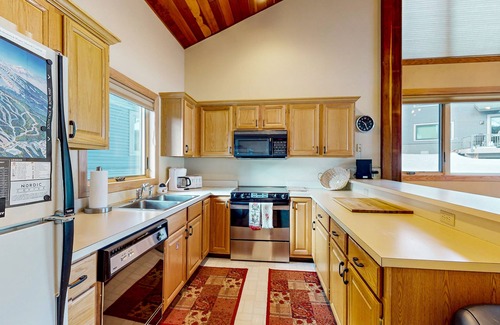 this ski-in/ski-out home away from home boasts a light-filled open floor plan with high vaulted ceilings and elegant wooden accents throughout, adding a rustic touch to your stay Spend entertaining evenings playing board games or watching fun shows and movies on the smart TV with streaming and cable services. (The fireplace is not operational.)