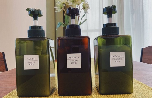 - face towel/bath towel, toothbrush/toothpaste, shampoo, conditioner, body soap, facial cleanser, hand soap, laundry detergent, dishwashing detergent, tissue, toilet paper