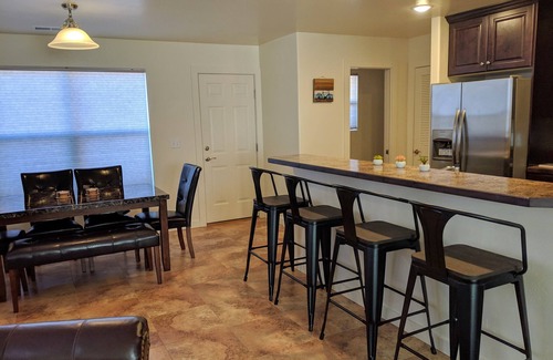Welcome to Slickrock Shangri-La. Our brand new town home has 2 bedrooms, 2.5 bathrooms and has beds for up to 8 guests. Fully stocked kitchen with all the comforts of home. 65" Samsung Smart TV with Blueray player. amazing views of moab rim, la sal mountains and more!