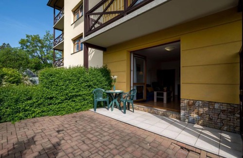 "sluneční stráň ii", 2-room apartment 46 m2, on the ground floor Spacious and bright, comfortable furnishings: living/sleeping room with 1 double sofabed and satellite TV. 1 room with 1 double bed. Kitchenette (2 ceramic glass hob hotplates, toaster, kettle, microwave) with dining table. Shower/WC. Terrace. Terrace furniture. Facilities: Internet (WiFi, free). Parking space n 317/5. Please note: suitable for families. Non-smokers only.