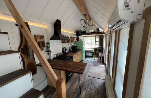 snowshoe hare is a cozy tiny home with a lofted king bed, full kitchen (with a compact, bar-style dining area), couch nook, and a full bath with a combination shower-tub It includes an outdoor deck space with a propane fire pit, gas grill, and seating. please note that the lofted sleeping quarters are accessed by a staircase and require some nimble maneuvering to get into bed—we think it’s super cozy, but please only book if you're on board with some ducking (see photos)!