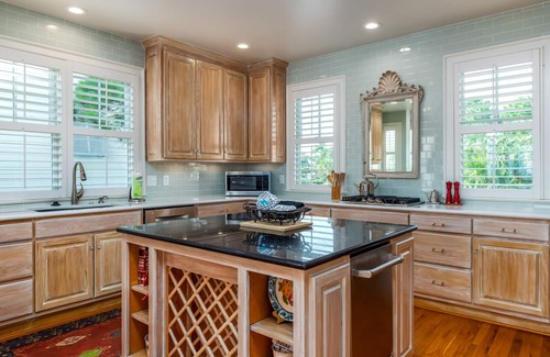 cooktop, large center island and quartz countertops a spacious deck spans the entire