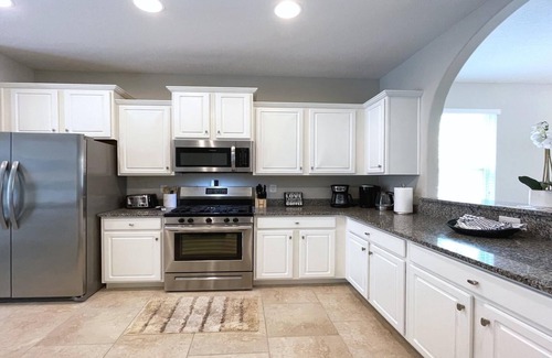 Located in Solterra Resort, just 7 miles to Walt Disney World in Orlando Florida, this beautiful villa features 5 bedrooms, 4.5 bathrooms, and sleeps up to 10 people. With your own private living area and a fully equipped kitchen, this home is perfect for your party to relax together and enjoy each other's company. This is a great home to provide you with more fun and relaxation after a long day in Walt Disney World or other Orlando attractions. All of our homes are professionally cleaned following enhanced safety and cleaning methods.