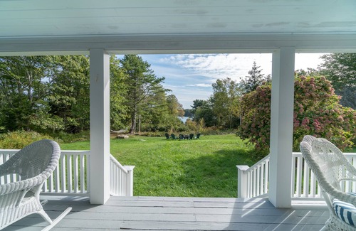 the home has been remodeled and updated with a large eat-in gourmet kitchen and tastefully decorated with local antiques and artwork Honed black marble countertops, kitchen island with seating for 5, top brand appliances including KitchenAid and Thermador gas burners, Damariscotta Pottery tile work, and well-stocked kitchen make for a wonderful retreat. New England charm abounds in this well-appointed cottage with top-grade bedding, down pillows and comforters and new mattresses. Outdoor living is equally inviting with a covered front porch, fire pit, and large outdoor screened-in porch. The cottage is surrounded by gardens and lawn with woods on three sides.