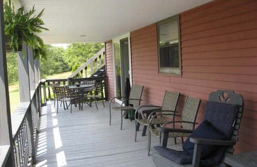 in this spacious home, you will find 5 large bedrooms and 35 baths. Four bedrooms & 2.5 baths are on the main and second floors and are available to groups of eight or less. Groups of over eight will also have automatic access to the bedroom & full bath in the basement. Access to the basement bedroom with a queen bed & bath can be made available to groups of eight or less by paying a fee of $50 (for the entirety of your stay). The first floor has a bedroom with a full-size bed and a half bath, and on the second floor there are 3 bedrooms and two full baths; a master bedroom (and bath) with a queen-size bed, another with a full-sized bed and one with two twins. Those three bedrooms are also furnished with comfortable futons for relaxing and extra sleeping space (2 doubles & 1 single). The main bathroom on the second floor is very spacious. Bed linens and towels are provided. To enjoy the outdoors and views there are 4 porches/decks. The rear porch is covered and is 25 feet in length at ground level. It's a great place to sit and relax while grilling dinner! From there you enter the home's mud room on the main floor. The front deck is also covered and is 46 feet in length. This deck can be accessed from both the living and dining rooms on the main floor & is furnished with an outdoor dining table & a number of comfortable chairs. The third outdoor space is a 10 foot open deck off the master bedroom on the 3rd floor. The living room, dining room, kitchen and mud room are all very large, which provides comfortable space for a large group. The kitchen is completely equipped with a gas range, refrigerator, dishwasher, microwave, toaster, coffee maker and cooking utensils/dishware. Coffee and a variety of cooking spices are provided for your convenience. We also provide minimal complimentary paper products (napkins, paper towels & toilet paper) to start you off on your stay, but you should plan to buy/bring extra with you. The living room is furnished with large, comfortable, pillow-back sofas and a chair. The love seat and over sized chair recline for complete relaxation while reading or watching TV. There is Dish Satellite and Internet service with a flat screen TV & DVD player for evening entertainment. The master bedroom on the second level also has a TV and DVD player.