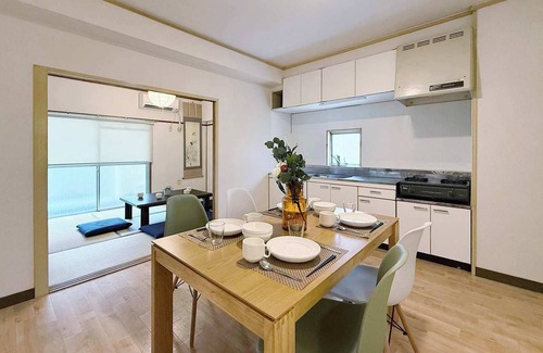 clean & spacious 3 bedroom apartment with elevator 5 mins walk to PeacePark. 1 train ride from Hiroshima sta via streetcar. Good for 9 people. The Japanese tatami room can turn into bedroom for 3 futons or kotatsu table can be set up during winter time. Kitchen with basic cooking needs & dining area. Separate toilet & bath. Washing machine. AC with heating function. All you need for a comfortable stay while you explore the city.