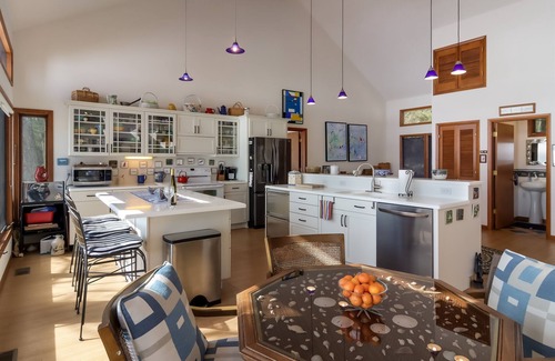 in the annex, the kitchen is completely open to the living space, with a large two-tier island that offers plenty of prep space and bar seating for four Gather for meals (or family game nights) at the huge wooden dining table for six.