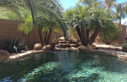 Fully furnished high end two story 4Br, 2 1/2 Ba, 3 car garage home with large pool, oversized heated jacuzzi and rock waterfall. Fiber optic high speed internet and professional pool and lawn service included. Home is equipped with everything you need from pots and pans to towels and sheets. Just bring yourself, I have you covered! I have worked with insurance companies and adjusters catering to displaced homeowners, traveling nurses, corporate stays and vacation travelers. Inside your find freshly painted large 19ft vaulted ceilings with a loft area equipped with couch, smart TV's, Foosball table and a Wii console. First floor has fine furniture throughout with a Tuscany feel about the space. It includes a fireplace, formal dining room, bar, reading space, open SS kitchen and king size master suite with private bath and dual sinks. Master bath includes separate shower and tub, very large walk-in closet with his and her sections. The second floor contains a large loft and 3 large bedrooms, all with new queen size beds. The backyard includes a professionally maintained beautiful pool and oversized heated spa with waterfall spilling into the pool. The space has a covered sitting area, umbrellas, pool toys and a Blackstone grill for your outdoor grilling pleasure. Community has multiple playgrounds and green areas. This home is 10 minutes from the Baseball Spring Training fields, shopping, Air Force base, golf courses, Wildlife Zoo, Desert Diamond Casino, Movie theaters, Bowling, Miniature golf and the White Tank Mountain state park. All utilities are covered. Come stay with us and leave winter behind while you enjoy a safe, clean desert life style with all Surprise AZ has to offer..