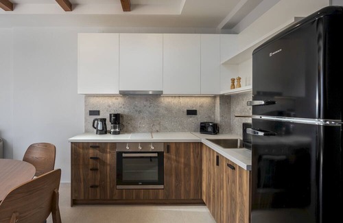 the open plan area features a fully equipped kitchen with a dining table and a modern living room The kitchen is equipped with all the essentials needed for a self-catered vacation.