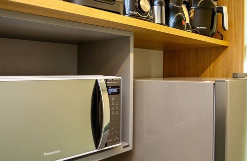 the kitchen is practical and modern, equipped with a 2-burner induction cooktop, refrigerator, microwave, air fryer, blender, electric coffee maker, sandwich maker, and a water purifier—providing everything you need to easily prepare your meals