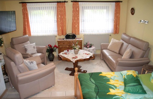 your holiday property: the holiday flat is surrounded by a 500 m² enclosed garden plot with meadow, trees, flowers and shrubs The property is enclosed by a fence. The landlord lives permanently in the house. Holiday flat II is located on the top floor of the house. The flat that can be booked here is located in the basement. The following are available for use: Terrace, parasol, garden furniture and barbecue.your holiday flat: 50 sqm, living/bedroom with 1 double bed and 1 single bed, cosy sitting area with couch and armchair, TV and radio, max. for 3 persons. Central heating. Entrance in the basement, via an internal staircase into the hallway with wardrobe and doors to all rooms. The hallway leads to the separate bathroom and separate WC. The kitchen is accessed from the living room/bedroom. This is equipped with table and max. 3 chairs, combined toaster, coffee machine and electric kettle. Ceramic hob (2 hotplates), fridge (ice compartment) and microwave are also part of the equipment. TV reception is via satellite.smoking is prohibited in the holiday flat.pets: not allowed.location: Putbus. The lovingly and functionally furnished holiday flat is located in a detached house, on the outskirts and in a quiet and sunny location. Access is via a side road. Car park on the property (for 1 car). Shop 500 m, restaurant 600 m, centre 1000 m. Railway station 1000 m. In Sellin: indoor swimming pool and sauna both 17 km. Indoor playground "Pirateninsel" 150 m, chalk cliffs Königsstuhl 22 km, Stralsund 30 km.In summer: Rügischer Bodden 2 km in Neuendorf (beach with meadow and sand). Golf in Karnitz. Minigolf in Sellin 10 km. Horse riding in Altkamp 3 km. Baltic Sea with sandy beach 12 km, Störtebeker Festival in Ralswiek from the end of June to the beginning of September 14 km.brief descriptionother : non-smoking houseshort description 1number of kitchens : 1other rooms : combined living room/bedroomsurroundingsleisure facilities : car hire, boat hire, bicycle hiresports facilities in the surrounding area : fishing, football pitch, cycling tours, riding area/equestrian facilities, rowing, sailing, sports centre, surfing, water skiinggarden and outdoor facilitiesgarden equipment : garden furniture available, barbecue