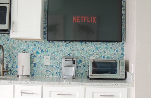 the kitchen features all new stainless-steel appliances including a cooktop, a full-size refrigerator with ice maker, and an over the cooktop sensor microwave It is fully stocked with small appliances such as a blender, countertop oven, and Keurig. All of the cooking utensils and accessories you could ever need to make the perfect meal, as well as complete dining service for eight are provided. The cabinetry is brand new and features ample storage space and soft close hinges. The counter tops are a stylish, modern solid-surface.