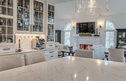 step inside the foyer and be greeted by soring ceilings, gleaming hardwood floors, and an abundance of natural light Unwind in the spacious living room, featuring a crackling fireplace, and plush furnishings that invite relaxation. Prepare gourmet meals in the chef's kitchen boasting commercial grade appliances, pristine 10 foot quartz island, and DeLonghi espresso machine.
