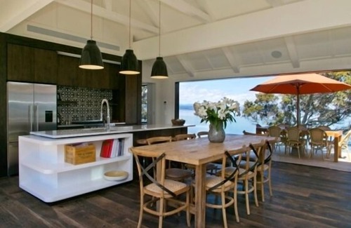 * open kitchen/living/ tv area with large glass sliding doors which completely open up to a huge deck over the lake on one side and a lovely internal grass courtyard on the other, which is perfect for lazy afternoons out of wind or for kids to run around & play safely
