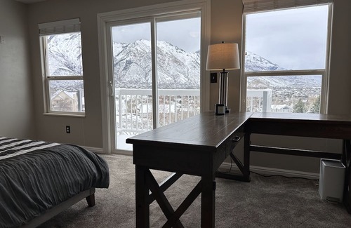 Want to feel like you are living a Hallmark movie. Come and stay in my home. I will treat you like royalty. This Alpine home boasts 5 bedrooms and 3 bathrooms with an office on the main floor and a great room with the most beautiful views you will find at this price point. The great room attaches to to a 350 square foot deck that overlooks the valley and a private neighborhood park with access from the fully-fenced backyard. The deck includes patio furniture, umbrellas, picnic table, fire pit, grill, and patio heater. There are stairs leading down to the backyard.