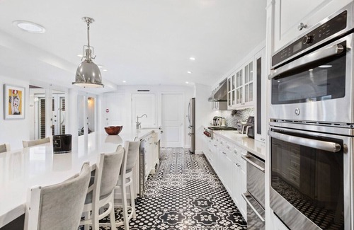 kindly be advised this property is offered for long term stays only, with the exception being filming with a city approved permit For this reason the daily rate is listed. For all other residential stays, the term must be for a minimum of six months and one day. The spacious living room, complete with a cozy fireplace and wet bar, flows seamlessly into the family room, adorned with a full bathroom, and the dining room—all of which boast large windows framing exquisite water views.
