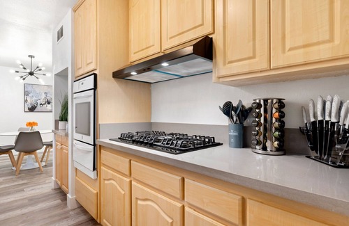 - kitchen: coffee maker, k-cup coffee machine, toaster, oven, fridge, dishwasher, cookware, dishes, glassware, utensils, oil, salts, and peppers